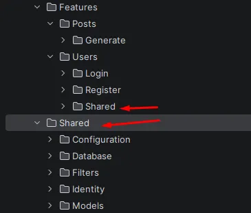 The Shared folder is mainly infrastructure and cross-cutting concerns, not for business logic. Also, you can have the Shared folders on a few levels: